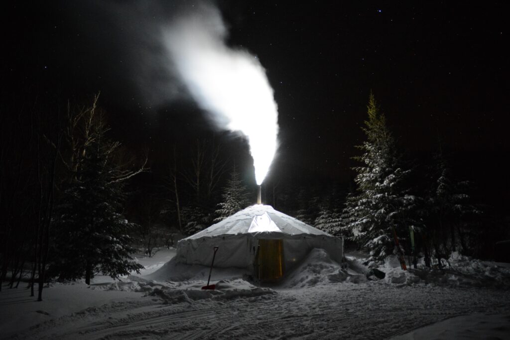 Le camp du Mont Paul est constitué d’une yourte double de 20 pieds par 40 pieds et héberge un groupe de clients ainsi que le personnel de guides. L’installation est lumineuse et chauffée avec un poêle à bois. L’ambiance et les équipements de cuisine en font un lieu de rassemblement après-ski et de restauration très apprécié de notre clientèle. Les participants sont responsables de leur nourriture et boissons. Notez que tout l’équipement de cuisine nécessaire est disponible au campement.